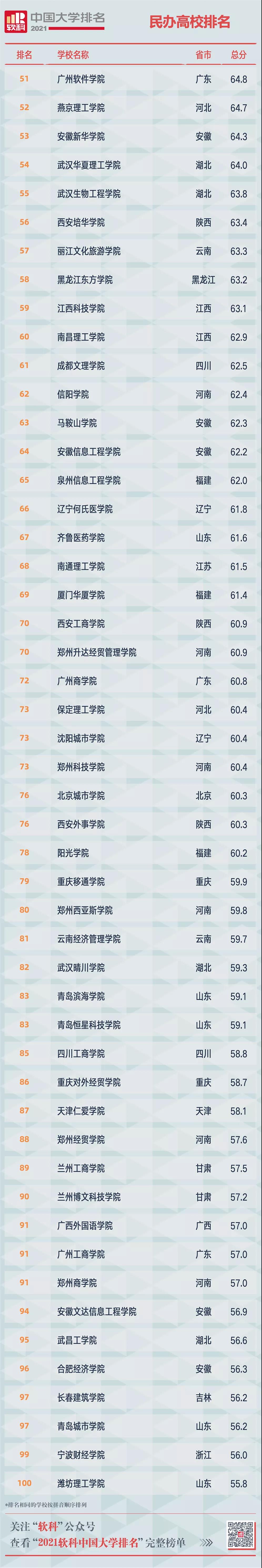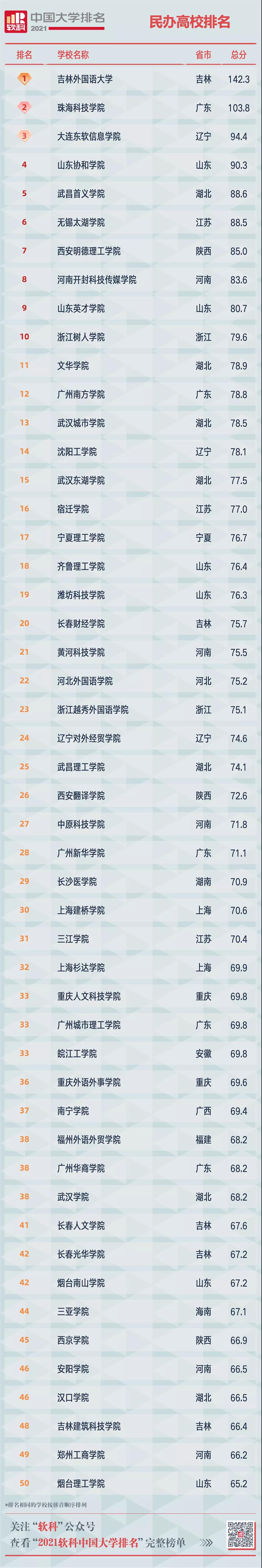 2021軟科中國民辦高校排名上榜高校共192所,排名最高的三所學校是吉林外國語大學、珠??萍紝W院、大連東軟信息學院。2021軟科中國民辦高校排名榜單中有46所是由獨立學院轉設而來,其中23所位列2021中國民辦高校排名百強,體現了率先完成轉設的這批獨立學院的辦學實力,他們的轉設將發揮示范作用,推動中國民辦高等教育規范發展。