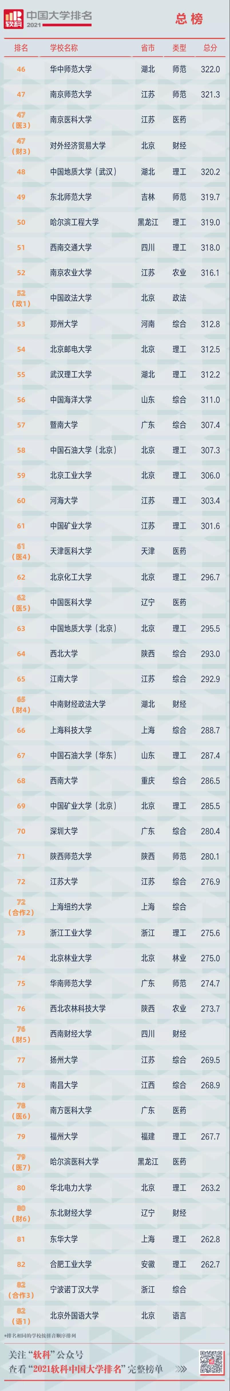 下表為綜合性大學排名、6個單科性大學和合作辦學大學的全國參考排名總榜單。