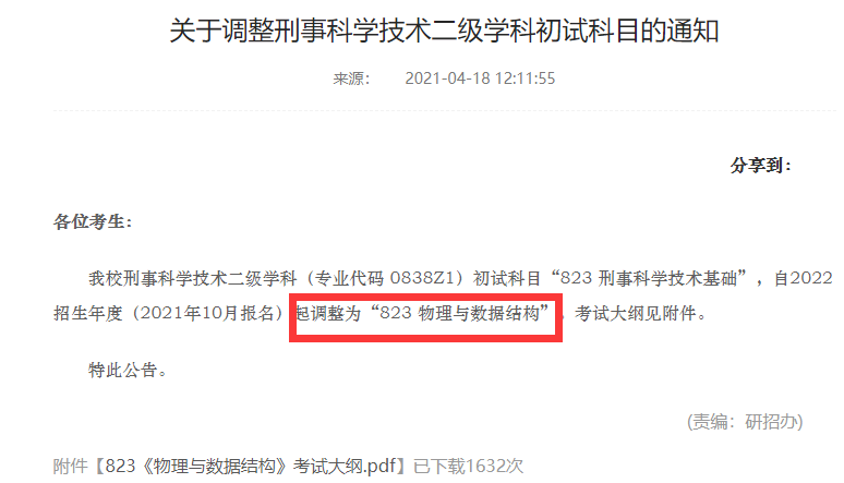 刑事科學技術二級學科(專業代碼 0838Z1)初試科目“823 刑事科學技術基礎”,自2022招生年度(2021年10月報名)起調整為“823 物理與數據結構”。
