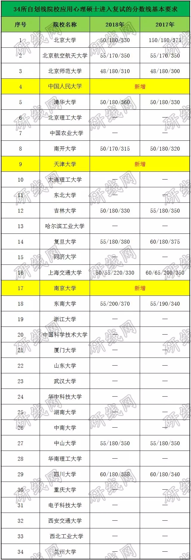應(yīng)用心理碩士進(jìn)入復(fù)試的基本成績(jī)要求(34所院校自劃線),如下圖: