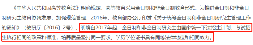教育部辦公廳早在去年發布了《關于進一步做好非全日制研究生就業工作的通知》,明確自2017年起,全日制和非全日制研究生由國家統一下達招生計劃,考生招生執行相同的政策和標準,培養質量堅持統一要求,學歷學位證書具有同等法律地位和效力。
