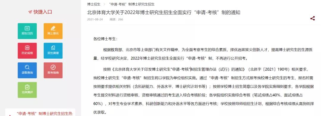8月24日,北京體育大學發布通知,明確學校2022年博士研究生招生全面實行“申請-考核”制,不再進行公開招考。