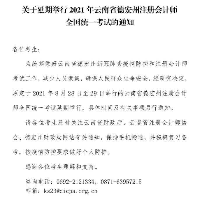 根據(jù)當(dāng)前我省疫情防控工作的要求,為切實(shí)保障廣大考生的健康安全,經(jīng)河南省財(cái)政廳注冊會(huì)計(jì)師考試委員會(huì)研究,報(bào)請上級有關(guān)部門批準(zhǔn),原定于2021年8月27日至29日舉行的河南考區(qū)注冊會(huì)計(jì)師全國統(tǒng)一考試延期舉行,具體時(shí)間另行通知。