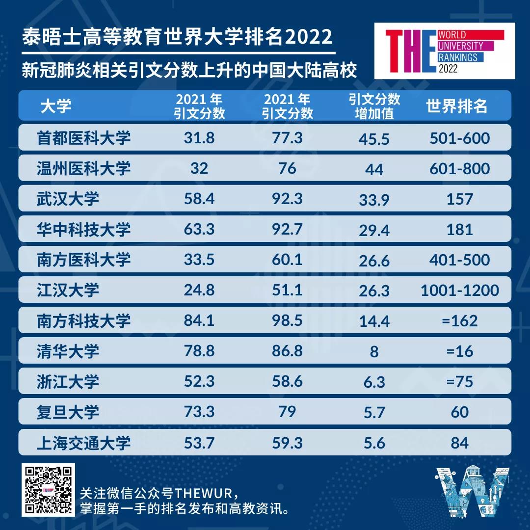 中國大陸 11 所高校的引文分數出現了提升,華中科技大學(第 181 位)、南方醫科大學(第 401-500 位)、首都醫科大學(第 501-600 位)和溫州醫科大學(第 601-800 位)的排名均至少上升了兩個區間。