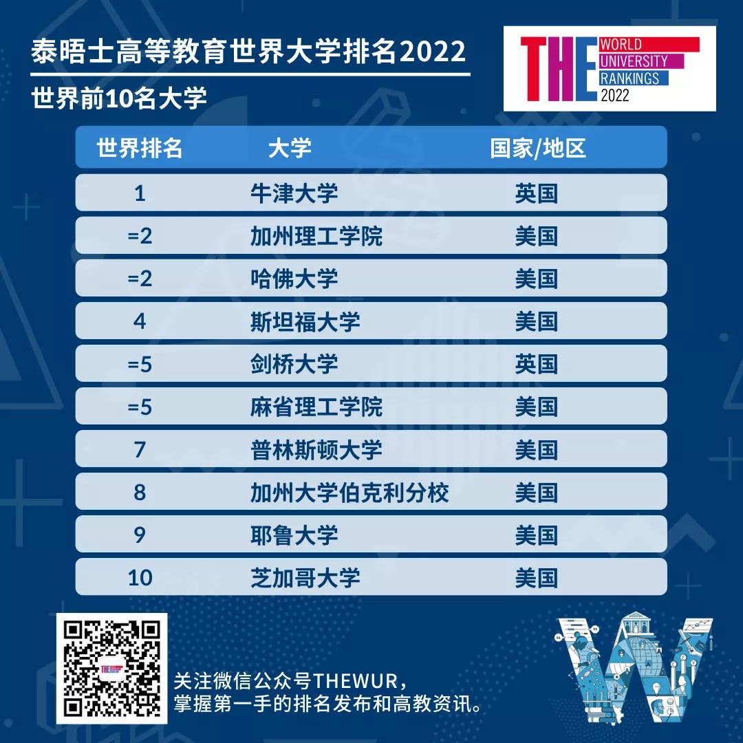 泰晤士高等教育于2021年9月2日北京時間早上7點發布了2022年度世界大學排名。