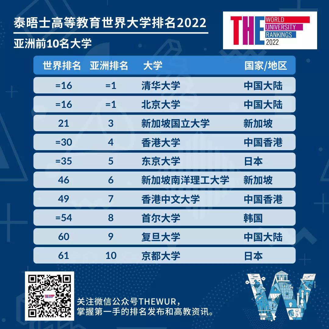 泰晤士高等教育今天公布了 2022 年泰晤士高等教育世界大學排名結果,清華大學和北京大學并列排名第 16 位,這是中國大陸高校有史以來的最高排名。