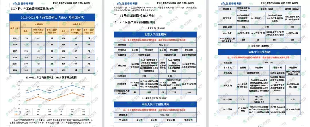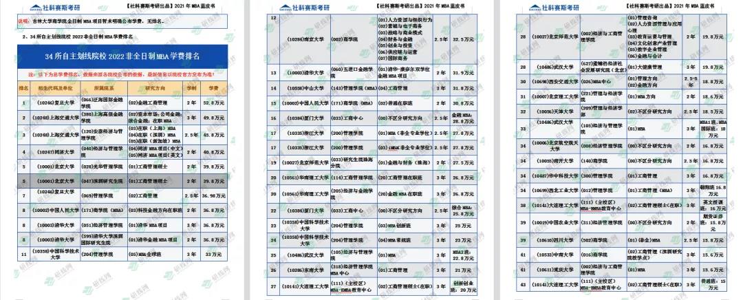 MBA初試內(nèi)容、科目與形式在藍(lán)皮書當(dāng)中均有介紹,這里不過多贅述。在MBA招考情況這一部分,涵蓋2016-2021考研MBA項(xiàng)目國(guó)家線、34所自劃線院校招生細(xì)則,如院校性質(zhì)(952、211)、學(xué)習(xí)方式(全日制、非全日制)、所屬院系、研究方向、學(xué)費(fèi)、學(xué)制(2/3年),招生人數(shù),復(fù)試分?jǐn)?shù)線、復(fù)試形式等,還將全日制項(xiàng)目、以及非全日制項(xiàng)目學(xué)費(fèi)進(jìn)行統(tǒng)一排名,詳細(xì)全面,幫助考生們快速查詢。