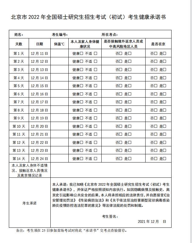 2.個人健康監測。從考前14天起,考生須每日進行自我健康監測,請下載并填寫《北京市2022年全國碩士研究生招生考試(初試)考生健康承諾書》(點擊下載)。從考前第14天(12月11日(含))開始,自行進行每日體溫測量、記錄和健康狀況監測。期間,凡出現發熱(體溫≥37.3℃)、咳嗽等呼吸道癥狀的,應及時主動向我考點報告,電話:010-83951759(工作日:8:00-11:30,13:00-16:30),郵箱:yanzhaoban cueb.edu.cn。