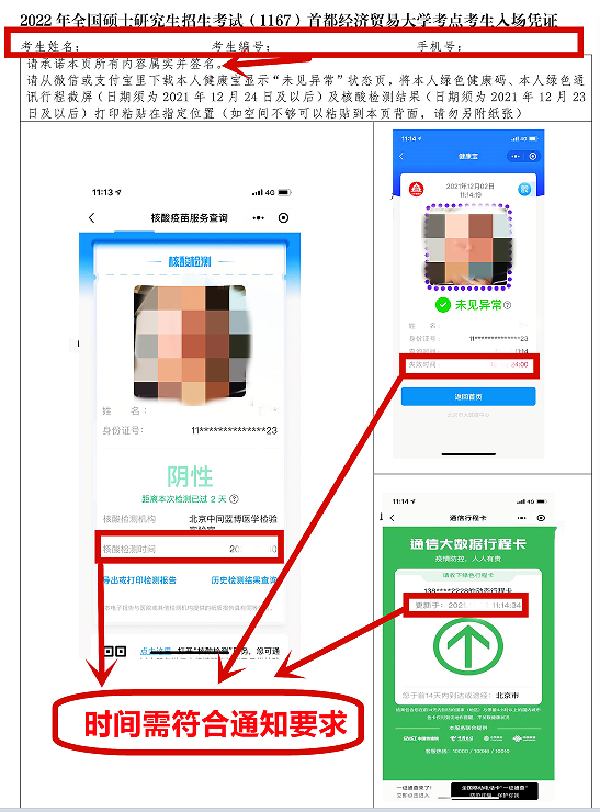 5.特別提示:《北京市2022年全國碩士研究生招生考試(初試)考生健康承諾書》與《(1167)首都經濟貿易大學考點考生入場憑證》請正反面打印,正面為《北京市2022年全國碩士研究生招生考試(初試)考生健康承諾書》,背面為《(1167)首都經濟貿易大學考點考生入場憑證》。每位考生需打印2份。其中一份考生參加首場考試入場時上交監考員由考點留存;另一份供考生參加余下考試科目進場使用)。