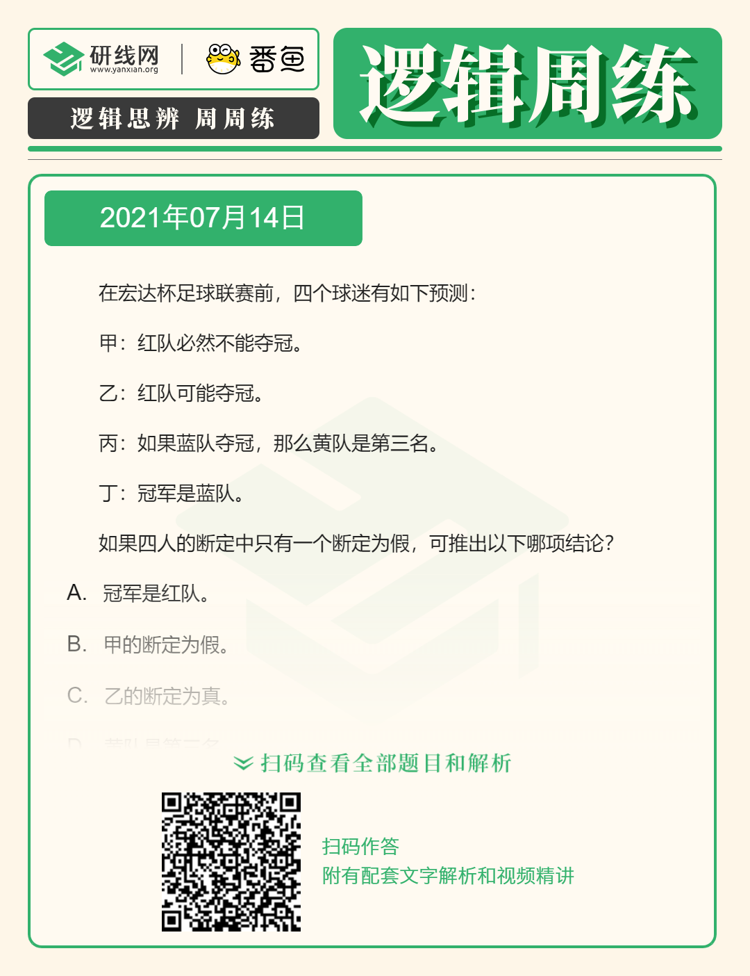 以上就是小編為大家整理“2022考研邏輯備考:7月14日邏輯專項練習及答案”的全部內容,希望各位考生堅持利用起來,想要獲取更多內容請持續關注本網站。