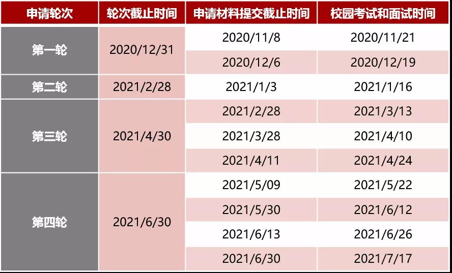 2) 條件錄取 準備或已預約參加雅思/托福等標準化考試的申請人如通過審核資格,可以先參加面試筆試,通過面試筆試后將收到“條件錄取”的結果。此類申請人須在2021年6月30日之前提交合格的考試成績以獲得正式錄取資格。