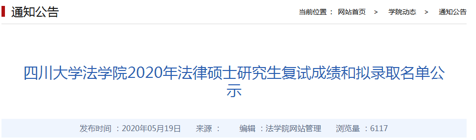 原標題:四川大學法學院2020年法律碩士研究生復試成績和擬錄取名單公示