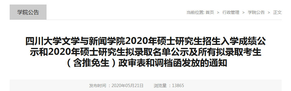 原標(biāo)題:四川大學(xué)文學(xué)與新聞學(xué)院2020年碩士研究生招生入學(xué)成績(jī)公示和2020年碩士研究生擬錄取名單公示及所有擬錄取考生(含推免生)政審表和調(diào)檔函發(fā)放的通知