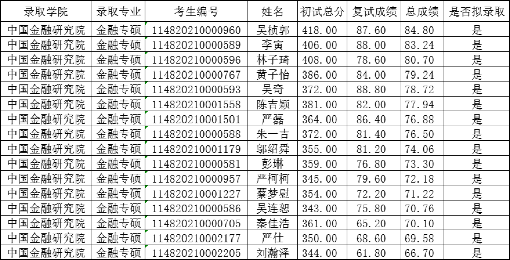 經浙江財經大學中國金融研究院碩士研究生復試專家小組復試,2020年浙江財經大學中國金融研究院金融專碩研究生一志愿擬錄取名單如下,現予以公示(公示期10個工作日)。如有異議,請聯系我院研究生辦公室,聯系電話:0571-86735252,聯系人:楊老師。
