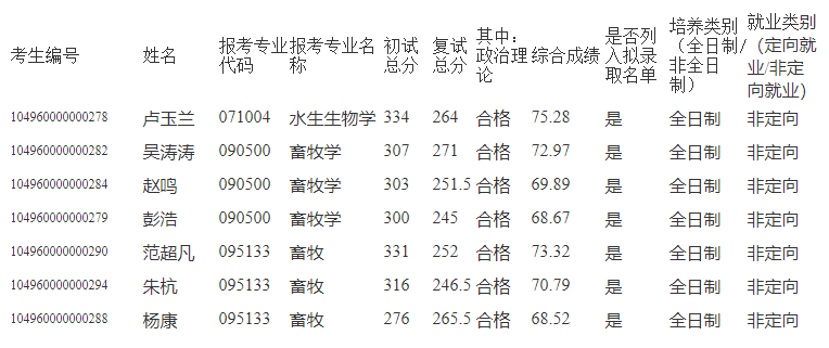 以上就是“2020考研擬錄取名單:武漢輕工大學動物科學與營養工程學院一志愿考生擬錄取名單”的全部內容,更多錄取名單相關內容,請持續關注!