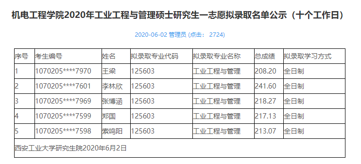 2020考研擬錄取名單:2020年西安工業大學機電工程學院工業工程與管理專業擬錄取名單公示