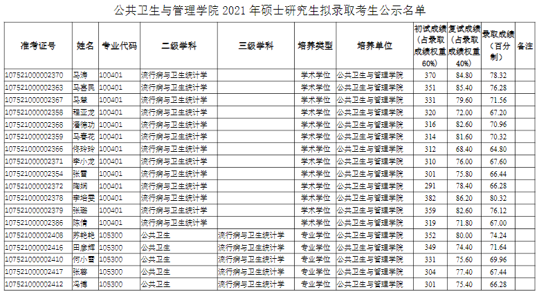 公共衛(wèi)生與管理學院2021年碩招一志愿考生擬錄取名單公示