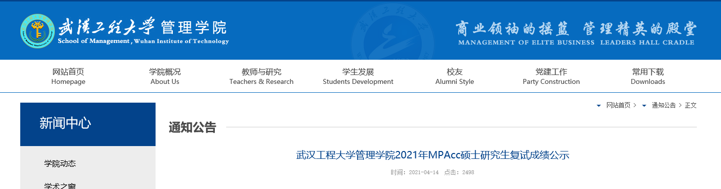 點擊查看:武漢工程大學(xué)管理學(xué)院2021年MPAcc碩士研究生復(fù)試成績公示