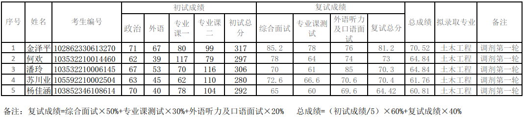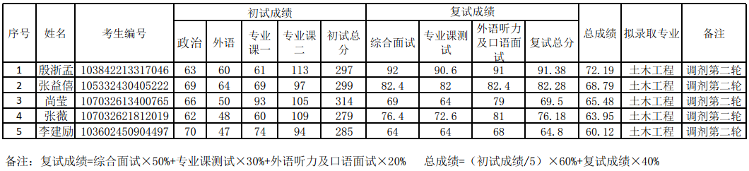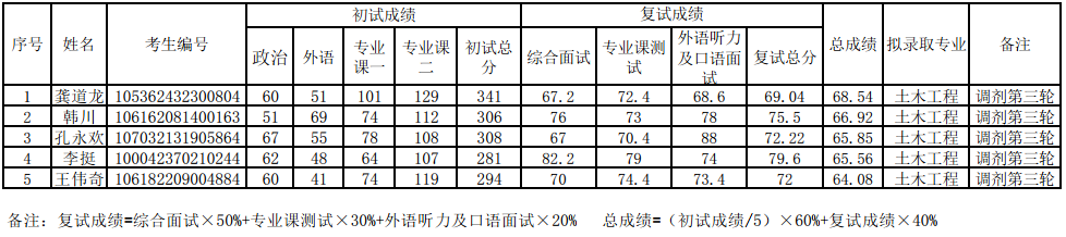 2022年土木工程碩士研究生調(diào)劑復(fù)試擬錄取名單(第五輪)