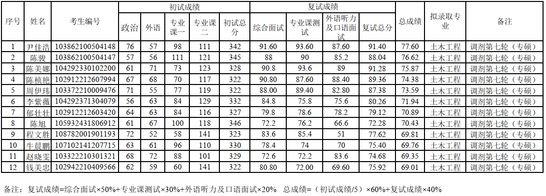 2022年土木工程碩士研究生調(diào)劑復(fù)試擬錄取名單(第七輪)