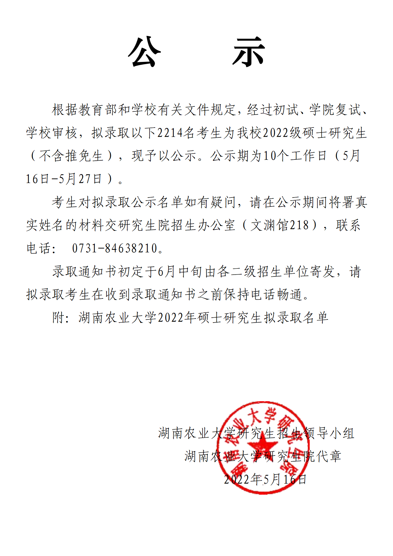 以上就是“2022考研擬錄取名單:湖南農業大學2022年碩士研究生擬錄取名單公示”的全部內容,更多錄取名單相關內容請持續關注本網站。
