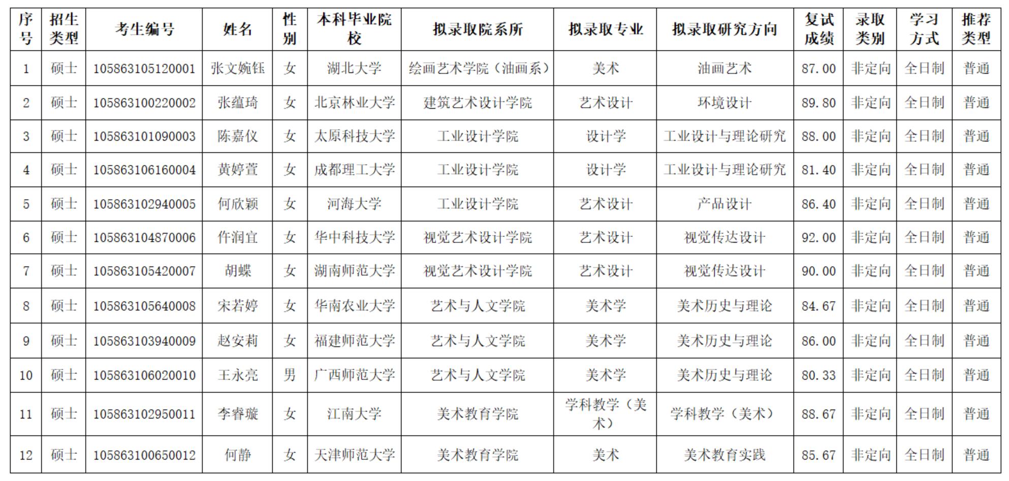 根據《廣州美術學院2023年接收校外優秀應屆畢業生免試攻讀碩士學位研究生辦法》、《廣州美術學院2023年接收校外優秀應屆畢業生免試攻讀碩士學位研究生復試工作安排》,綜合審查考生的報名資料、復試成績、體檢結果、思想政治品德考核情況,擬錄取12名校外推免生為我校2023年碩士研究生,并報教育部審核,最終錄取結果以教育部錄取檢查審核通過為準。擬錄取名單公示如下: