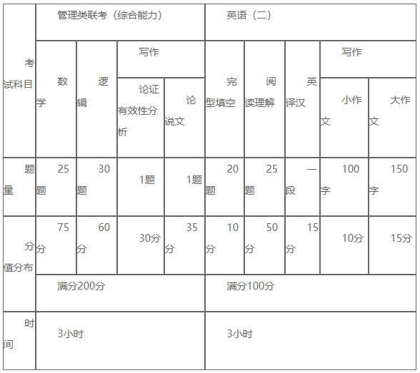管理類(lèi)聯(lián)考綜合能力(199)(包含數(shù)學(xué)75、寫(xiě)作65、邏輯60,共200分)、英語(yǔ)二(204)(共100分)。