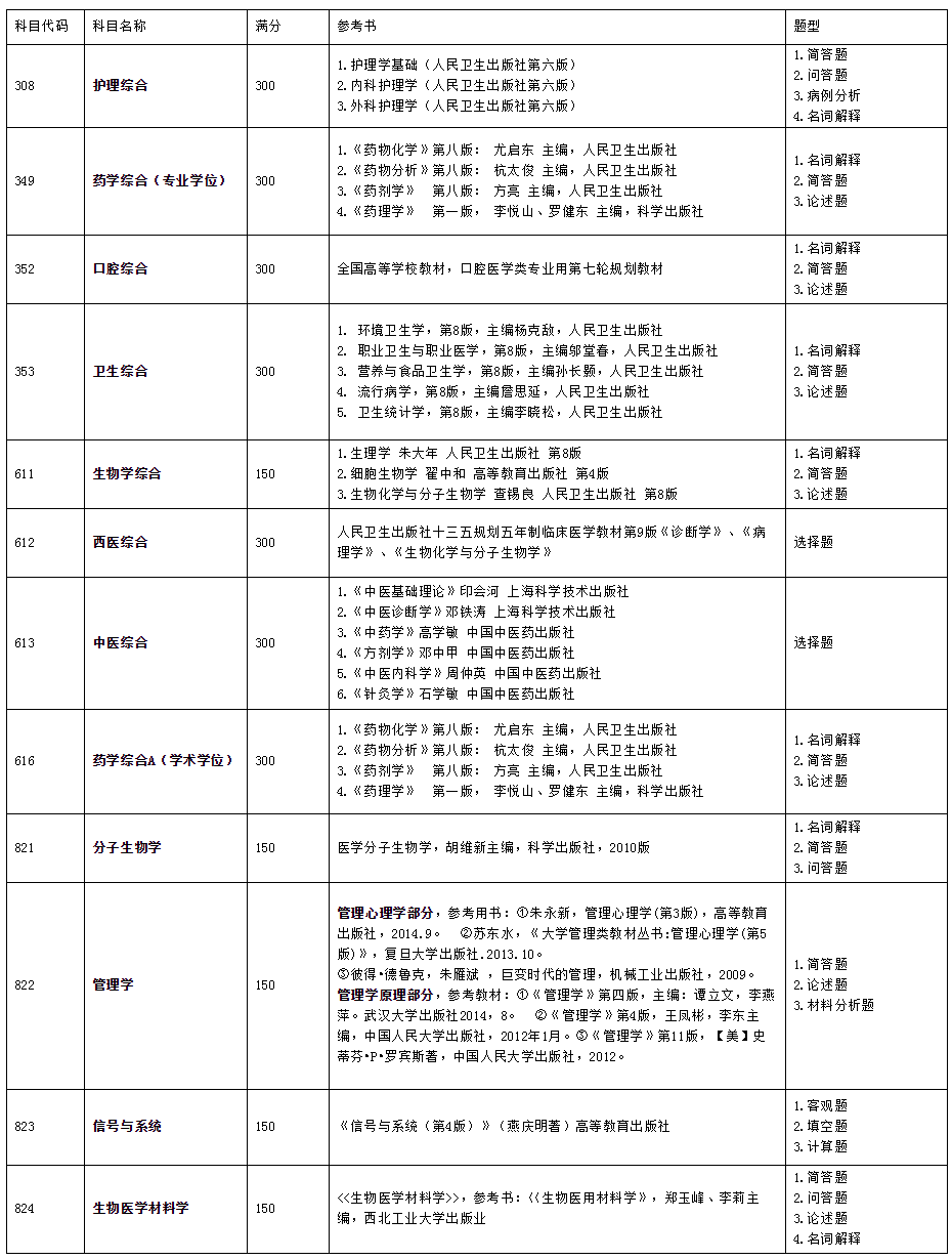 廣州醫科大學2020年碩士研究生招生考試自命題科目參考書目和題型