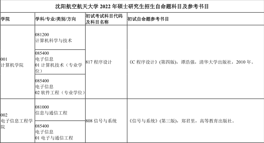 沈陽航空航天大學2022年碩士研究生招生自命題科目及參考書目