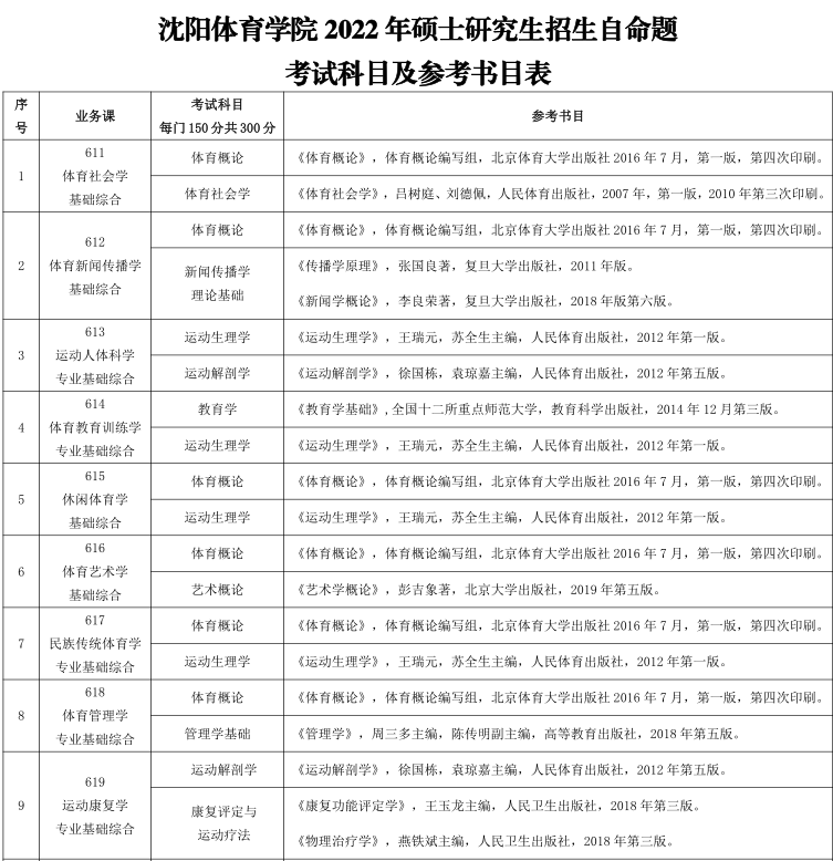 沈陽體育學院2022年碩士研究生招生自命題考試科目及參考書目表
