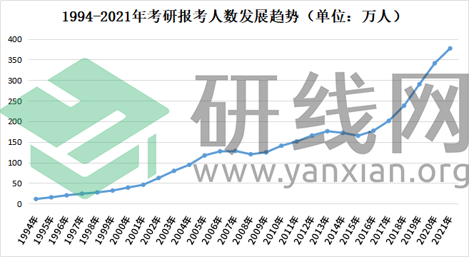 2021年研究生招生考試報名達到377萬人。研究生報名人數在2014年、2015年出現短暫的下滑后,2016年開始增長,報名人數從160萬人左右迅速突破200萬人,2021年的報名人數在去年341萬人的基礎上再次大漲,幾年時間實現了倍增,2022屆考研人數突破400萬大關是基本沒問題的,預測將直奔420萬!擴招的大趨勢已經不可避免。