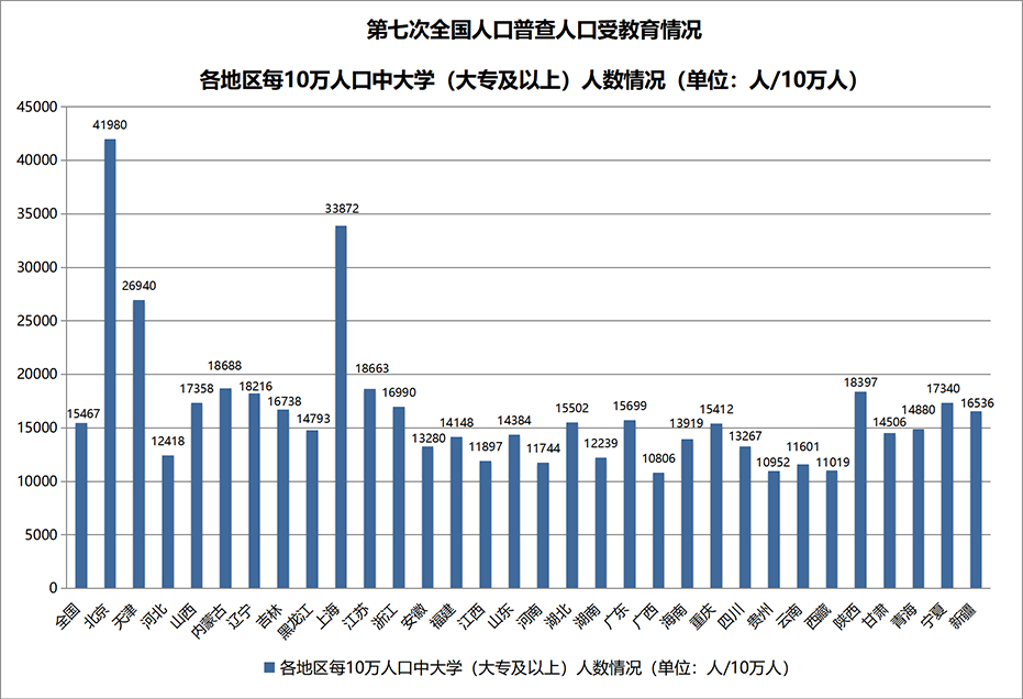 根據上述數據顯示,全國具有大學文化程度的人口為21836萬人,即每7人中就有1人為大學或以上文化水平。