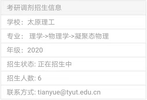 以上就是“2020考研調劑信息:太原理工大學理學凝聚態物理接收碩士調劑生”,的全部內容,2020考研全國調劑綜合服務平臺正式上線!三大功能亮點,幫你輕松調劑!