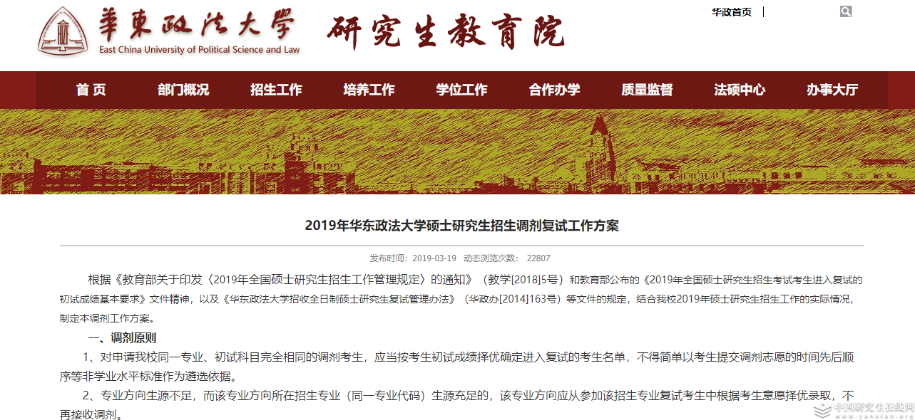 根據(jù)《教育部關于印發(fā)〈2019年全國碩士研究生招生工作管理規(guī)定〉的通知》(教學[2018]5號)和教育部公布的《2019年全國碩士研究生招生考試考生進入復試的初試成績基本要求》文件精神,以及《華東政法大學招收全日制碩士研究生復試管理辦法》(華政辦[2014]163號)等文件的規(guī)定,結合我校2019年碩士研究生招生工作的實際情況,制定本調劑工作方案。