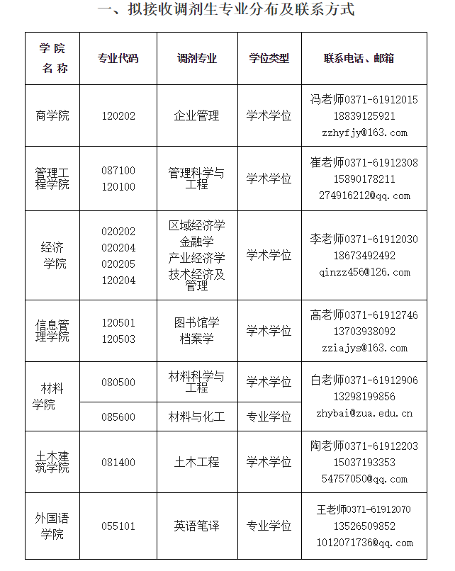 我校目前有工商管理、管理科學與工程、圖書情報與檔案管理、應用經濟學、材料科學與工程和土木工程共 6 個碩士學位一級學科授權點,材料工程、會計、圖書情報和英語翻譯共 4 個專業碩士點。2020年擬接收調劑生信息如下: