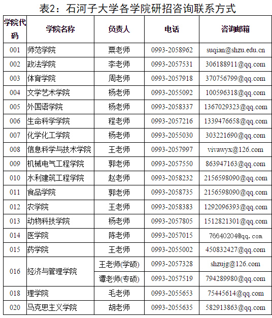根據教育部公布的《2020年全國碩士硏究生招生考試進入復試的初試成績基本要求》B區線要求,我校部分專業一志愿上線情況良好,預計不接受調劑(表1),具體調劑信息以后期國家研招網調劑平臺發布的調劑信息為準。目前《石河子大學2020年碩士研究生復試錄取工作方案》正在報上級部門審定中,屆時復試方式、復試時間、調劑公告等重要信息將會在“石河子大學研究生招生信息網”(http://yz.shzu.edu.cn/)主頁及相關學院網站及時公布,請考生關注查看。相關信息公布前,請考生耐心等待,確有特殊情況或需要進一步了解相關內容的,可向相關學院咨詢(表2)。