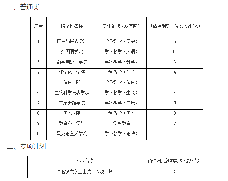 2021年全國碩士研究生招生考試進入復試的初試成績基本要求已經公布,今年我校教育碩士各專業領域(方向)尚有部分缺額,預估有一定調劑參加復試人數,具體以下: