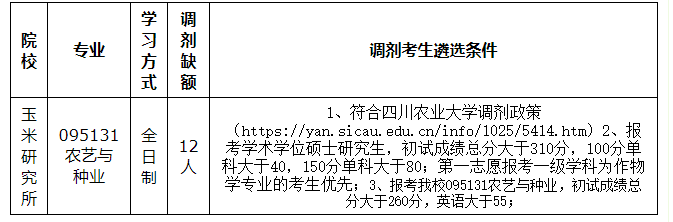 根據(jù)四川農(nóng)業(yè)大學(xué)《2021年招收攻讀碩士學(xué)位研究生復(fù)試、調(diào)劑、錄取工作辦法》和復(fù)試工作日程安排。經(jīng)玉米所研究生招生工作領(lǐng)導(dǎo)小組審議通過,現(xiàn)將玉米研究所2021年碩士研究生調(diào)劑工作安排如下: