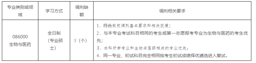 根據四川農業大學2021年碩士研究生招生復試工作總體安排,我院全日制生物與醫藥(專業代碼是086000)接收調劑考生。調劑嚴格按照教育部和學校的相關要求執行,根據第一志愿實際參加復試后擬錄取情況,通過“全國碩士生招生調劑服務系統”及時、準確發布計劃余額及接收考生調劑的初試成績等基本要求?,F將相關事宜安排如下: