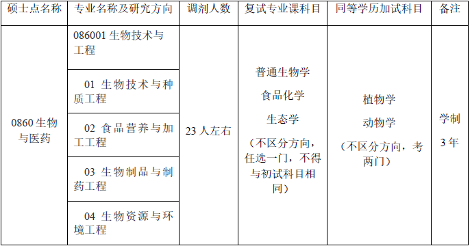 5.調入專業初試專業代碼以08開頭;初試專業課科目與生物、食品、環境相關。(符合調劑條件的初試專業如:生物與醫藥(0860)、資源與環境(0857)、環境科學與工程(0830)、食品科學與工程(0832)、生物工程(0836)等其他以08代碼開頭的專業。)