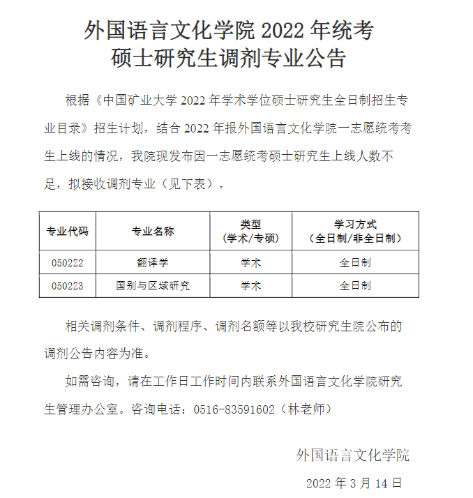 2022年中國礦業(yè)大學(xué)外國語言文化學(xué)院翻譯學(xué)、國別與區(qū)域研究調(diào)劑信息