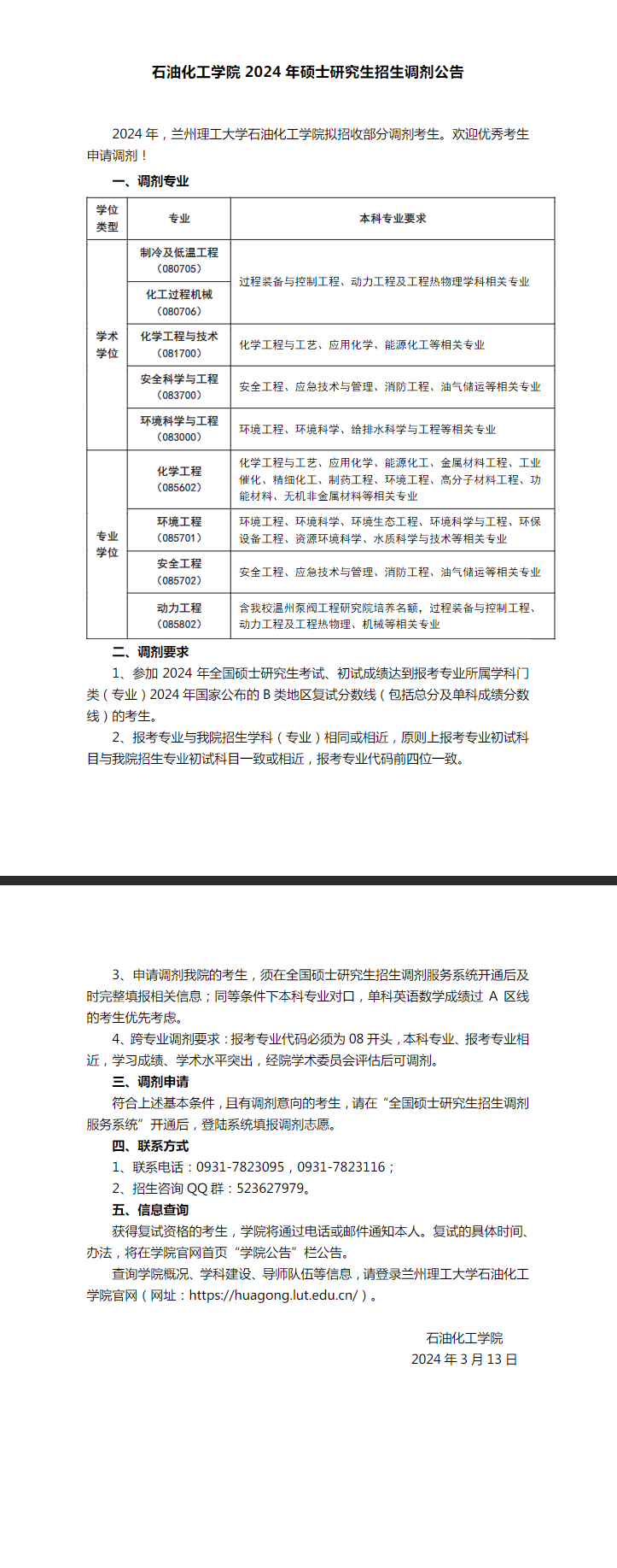 考研是場信息戰,必須搶占先機!考研調劑更是如此。小編整理了“2024考研調劑:蘭州理工大學石化學院2024年碩士研究生招生調劑公告”的內容,各位考生了解一下~