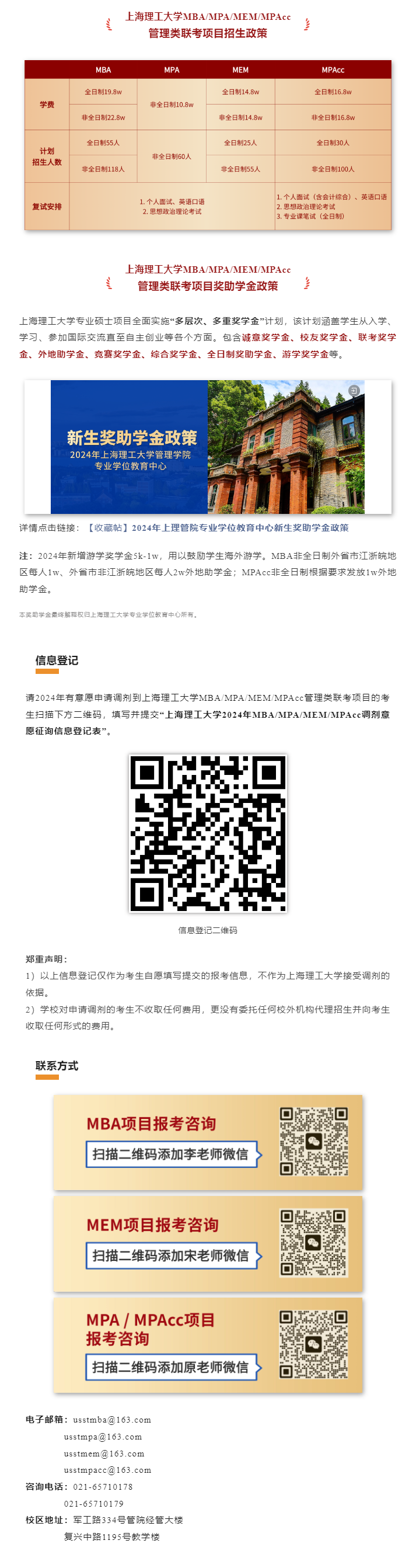 2024考研調劑:上海理工大學2024年MBA/MPA/MEM/MPAcc管理類聯考項目調劑意愿征詢信息通知