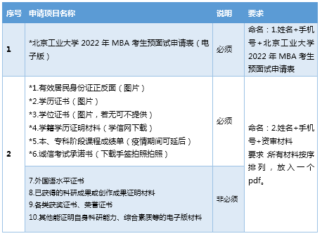 2.申請材料:請將《北京工業大學2022年MBA考生預面試申請表》和資審材料放入同一文件夾(見原文鏈接附件),壓縮打包后發送,郵件名稱和文件夾名稱為“第x批2022MBA預面試+姓名+手機號”。
