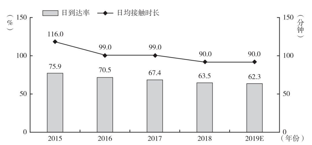 圖5:2015-2019年電視在城市居民的日到達率及日均接觸時長