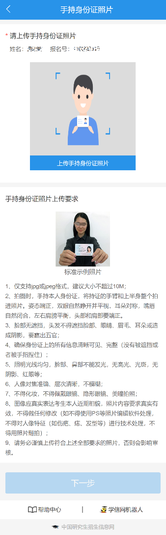 (3)考生本人手持身份證照片。拍攝時,將持證的手臂和上半身整個拍進照片,頭部和肩部要端正,頭發不得遮擋臉部或造成陰影,要露出五官;確保身份證上的所有信息可見、完整。