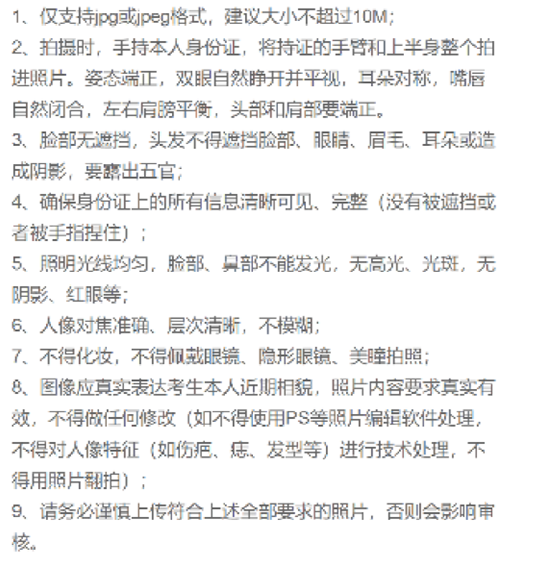 考生須于上述規定時間內登錄網上確認平臺,按系統提示及要求完成“同意考生誠信考試承諾書、核對網報信息、上傳準考證照片(本人圖像)、上傳身份證照片、上傳手持身份證照片及其它相關材料照片”等手續。圖片上傳過程中請耐心等待,不要頻繁刷新。