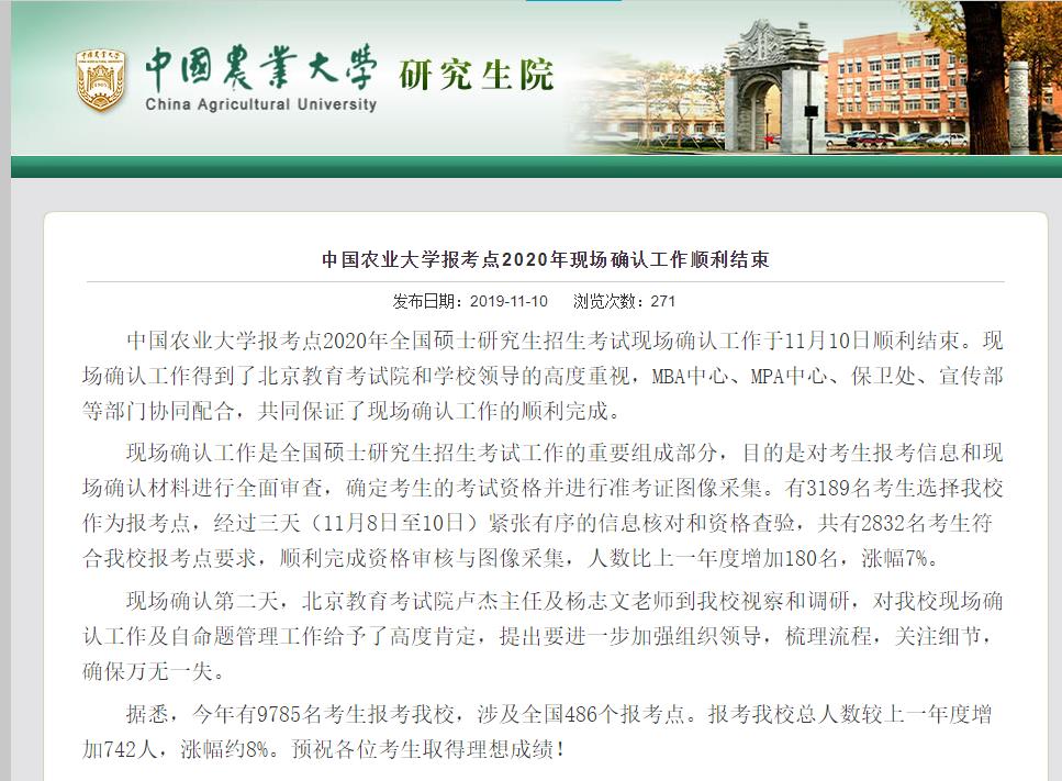 中國農(nóng)業(yè)大學(xué)報考點(diǎn)2020年全國碩士研究生招生考試現(xiàn)場確認(rèn)工作于11月10日順利結(jié)束?,F(xiàn)場確認(rèn)工作得到了北京教育考試院和學(xué)校領(lǐng)導(dǎo)的高度重視,MBA中心、MPA中心、保衛(wèi)處、宣傳部等部門協(xié)同配合,共同保證了現(xiàn)場確認(rèn)工作的順利完成。