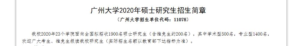 廣州大學2020年研究生招生計劃約為1900名,2021年全日制招生計劃約為2900名,同比增長1000名,其中主要是學術型研究生的擴招,由2020年的500名,擴招到了850名。專業型碩士由1400名擴招到了2050名。