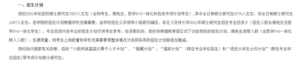 吉林大學2020年研究生招生計劃約為7535名,2021年全日制招生計劃約為7827名,同比增長292名。